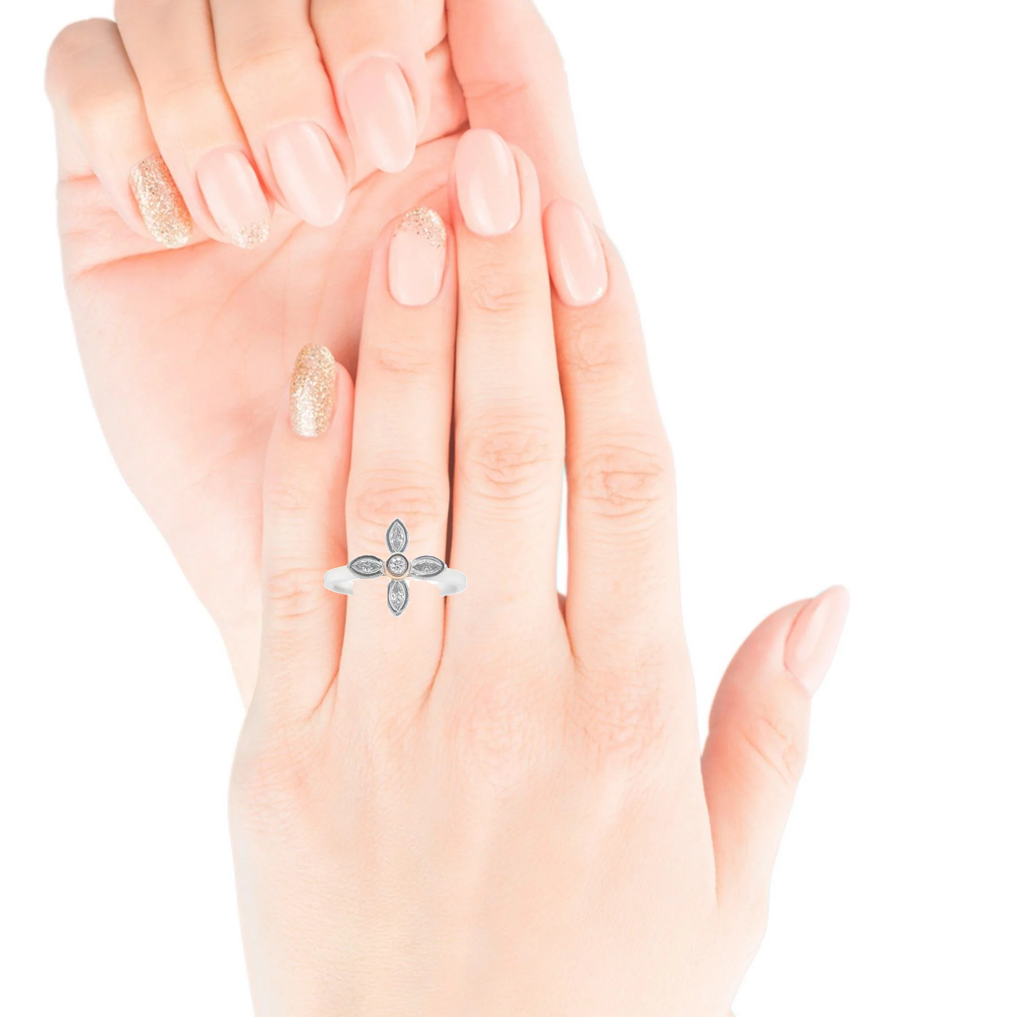A stunning platinum & 9ct rose gold diamond petal ring featuring 4 sparkling marquese-cut diamonds & a round brilliant cut bezel set centre diamond. The ring has a unique floral design with petals forming a beautiful, intricate pattern around the center diamond.